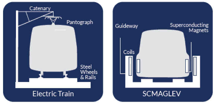 The keys to the SCMAGLEV system’s high speed and acceleration are the magnetic forces acting between powerful superconducting magnets located on board the trains and two sets of coils that are installed in the walls of the guideway.